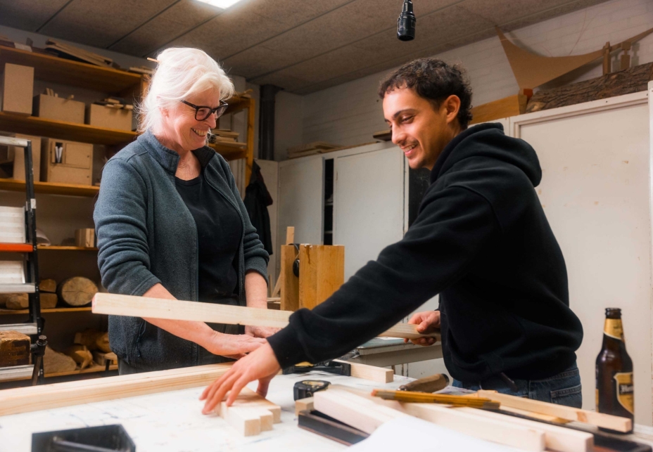 Karin Elferink is een beelddenker. En hout is het materiaal waarmee ze de beelden in haar hoofd het beste kan realiseren, zowel twee- als driedimensionaal. Ze laat zich snel inspireren door haar cursisten en vindt het heerlijk om haar kennis over hout en meubelmaken over te dragen, samen problemen op te lossen en van de gebaande paden af te wijken.