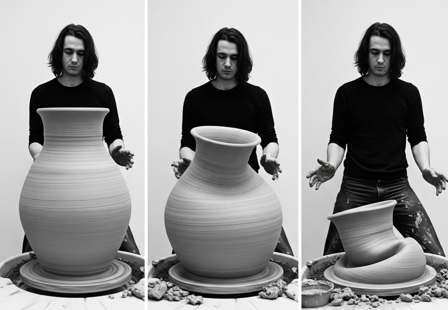 What happens when you work with clay on the turning wheel? It’s not only about the clay, but also about taking control of the speed of the wheel, the way the clay wants to wiggle, to move and shift. It’s up to you to control or accept this process….