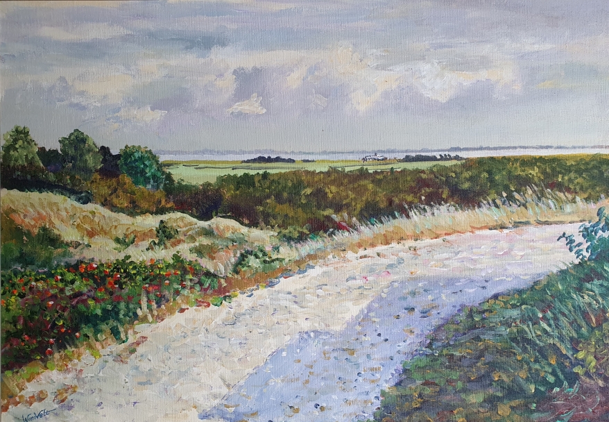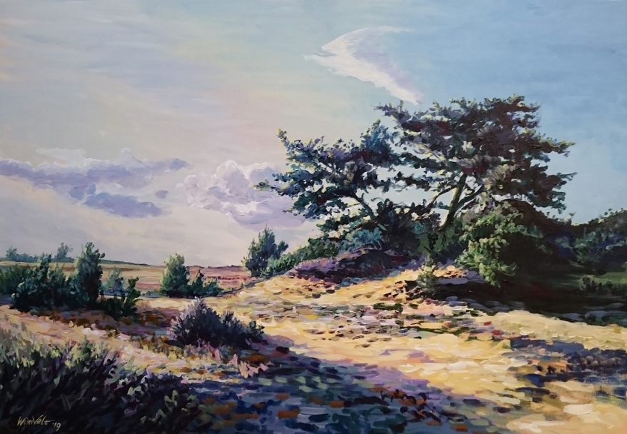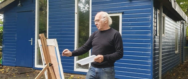 “Ik ben Wim Velt, ik ben 10 jaar medisch tekenaar geweest en daarna 30 jaar landschapschilder. Mij heeft dat heel veel fijne momenten geleverd, die ik anderen ook graag gun en van de ervaring die ik heb opgebouwd hoop ik wat over te dragen op wie dat wil. Het wordt schilderen naar waarneming. Dat hoeft niet fotografisch juist, maar het geeft iets meer houvast dan het puur abstracte, waar ik zelf niet veel mee kan. En lekker snel en zorgeloos. Met acrylverf kan je alles weer veranderen"