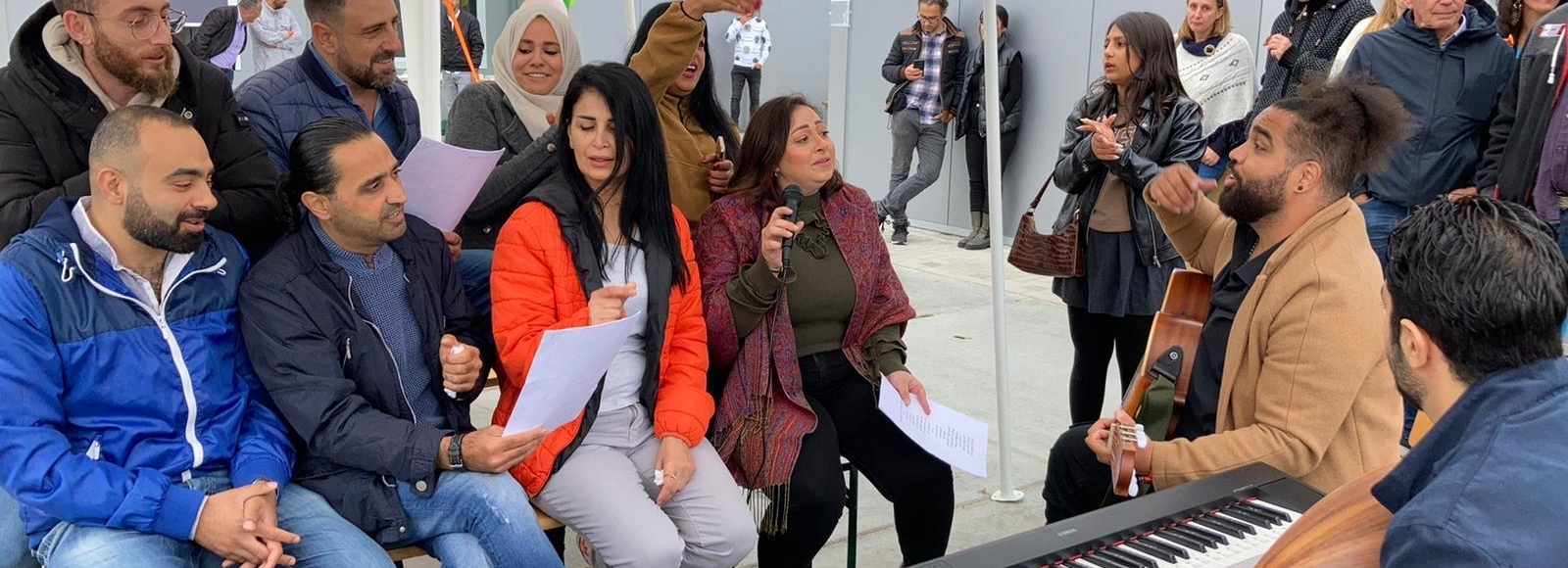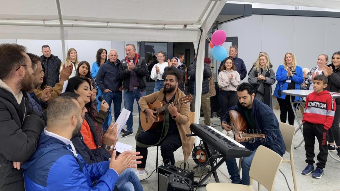 Groningen, zaterdagmiddag, een winderig industrieterrein. Op een strook niemandsland langs de ring wapperen felgekleurde ballonnen en vlaggetjes. Honderd mensen wonen hier. Gezinnen gevlucht voor geweld. Hun leven bestaat uit wachten. Lang wachten temidden van voorbijrazend verkeer, loodsen en autogarages. Maar 24 september was het feest. Want het is burendag en het COA hield open huis. Een mooie gelegenheid voor cultuurcoach Karam Shebat om op te treden met de jonge en volwassenen bewoners aan wie hij zang- en gitaarlessen heeft gegeven. En voor beeldhouwer Natasja Bennink om de boetseerwerken te exposeren die de bewoners onder haar begeleiding hebben gemaakt. Onder de vlag van VRIJDAG in de Buurt verzorgden Karam, Natasja en andere docenten de afgelopen maanden culturele workshops in het AZC. Tussen de grijze gebouwen op het desolate terrein wordt gezongen, geklapt en gedanst. Kinderen die ‘Imagine’ zingen. De zorgen even vergeten. De tijd verdreven. Blije gezichten, verbinding tussen culturen.