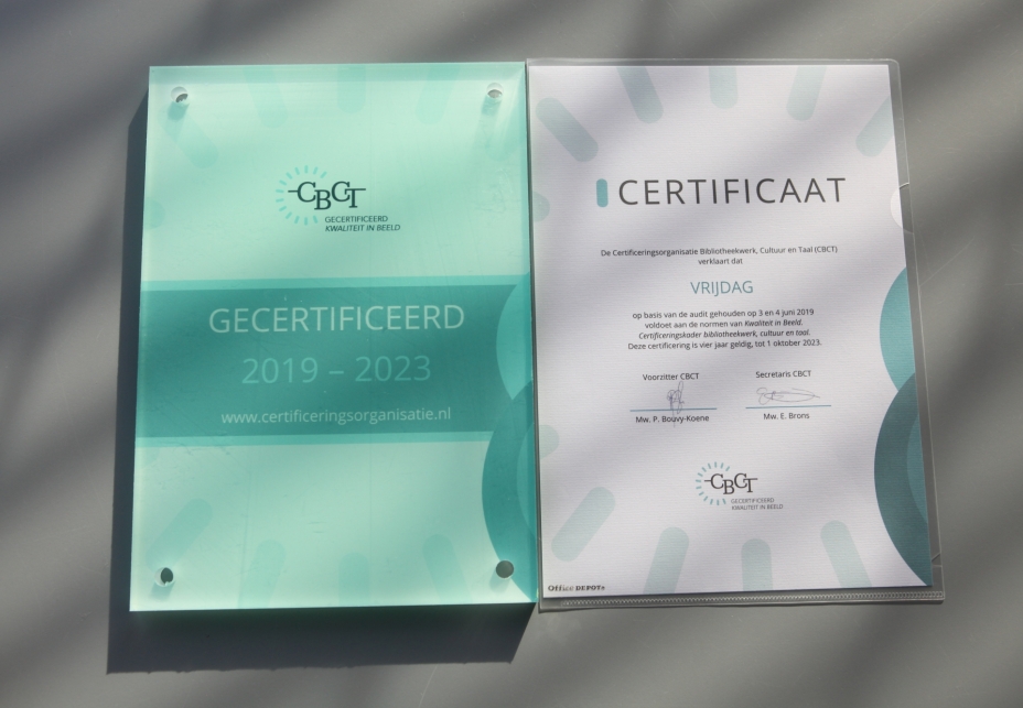 VRIJDAG heeft in juni 2019 een officieel kwaliteitscertificaat ontvangen van de Certificeringsorganisatie Bibliotheekwerk, Cultuur en Taal (CBCT). Hiermee voldoet de organisatie aan de kwaliteitsnormen van Kwaliteit in Beeld die gelden voor Bibliotheken, Cultuurcentra en Taalhuizen.
