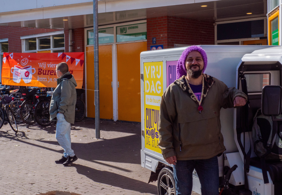 Met de inzet van mobiele cultuurkiosk De Slak creëert VRIJDAG in de Buurt op vele plekken in de wijken en dorpen van Groningen kleine festivalletjes. Het is een elektrische tuktuk waarmee Azer Mammadov (muzikant/kunstenaar afkomstig uit Azerbeidzjan) spontane ontmoetingen op straat stimuleert, mensen uitnodigt zich creatief te uiten, positief verrast en tegenwicht biedt aan de dagelijkse ratrace die veel mensen in hun greep houdt.